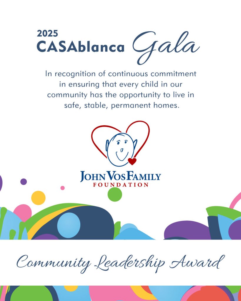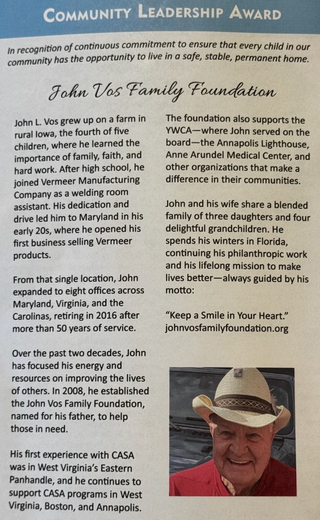 John and Chris Vos attended the annual Anne Arundel County CASA Gala where John accepted a Community Leadership Award on behalf of the John Vos Family Foundation. This prestigious award recognizes outstanding dedication to ensuring that every child has the opportunity to live in a safe, stable, and permanent home.